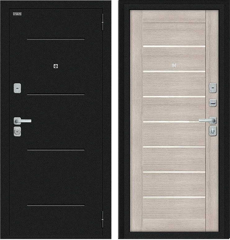 Надежная входная Дверь Браво Техно/BChrome Букле черное/Cappuccino Melinga премиум класса по цене 34 699 руб. Большая толщина стали защитит от проникновения в ваш дом, квартиру или коттедж. Используется очень качественная фурнитура: замки, цилиндры, ручки, защелки. Покрытие и отделка двери изготовлено под внимательным контролем производителя. Дверь имеет долгий срок службы и гарантию.
